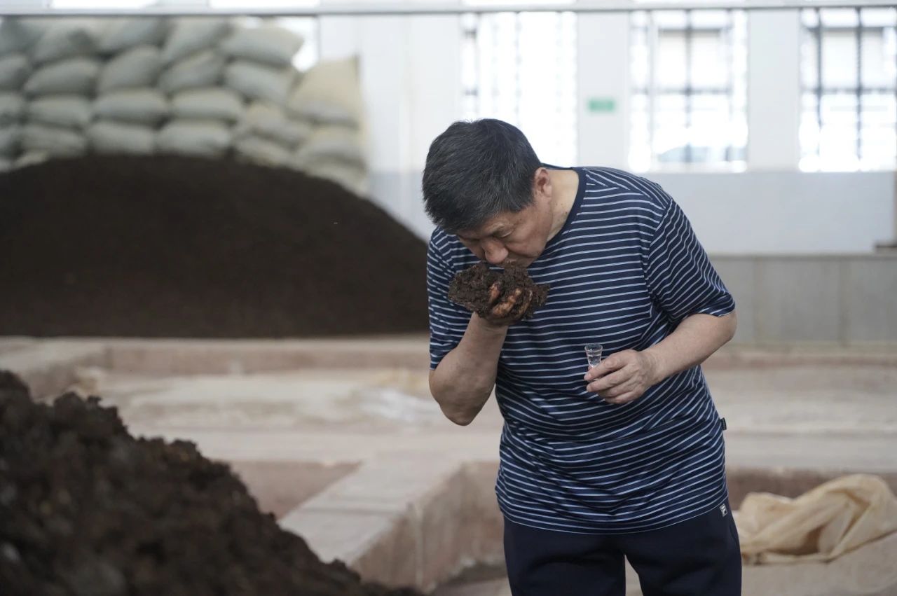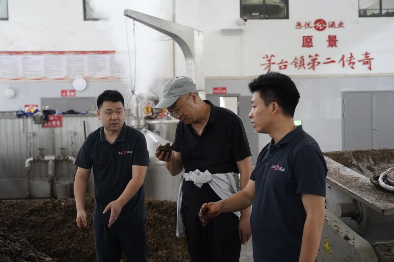 专职技术专家吕云怀(右二)检查酒糟质量