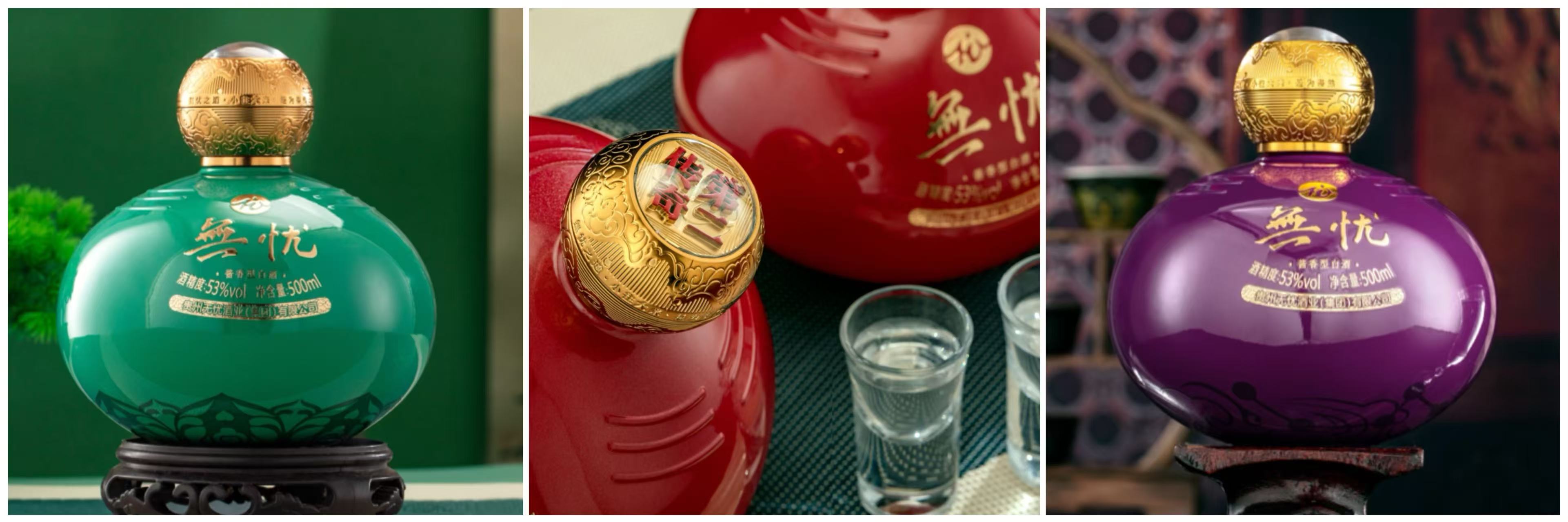 1. 无忧礼数酒系列 无我(绿色)、仁者(红色)、无为(紫色)